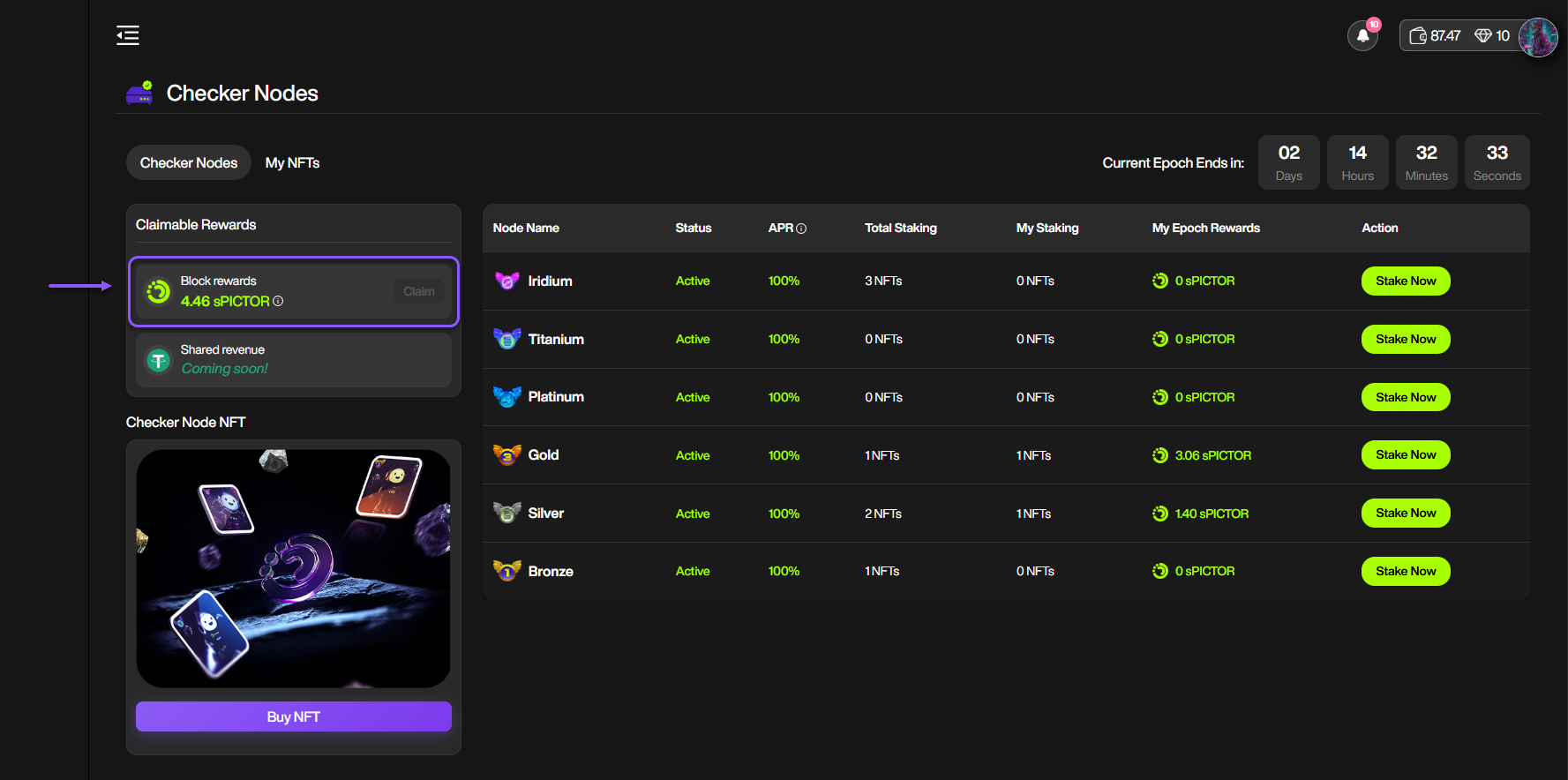 **Note**: Your Block Rewards are currently distributed as a sub token and will be converted 1:1 to PICTOR token at TGE for you to claim.